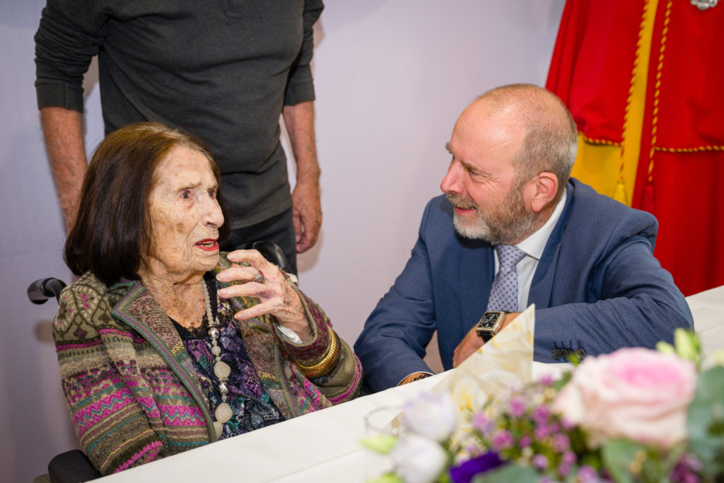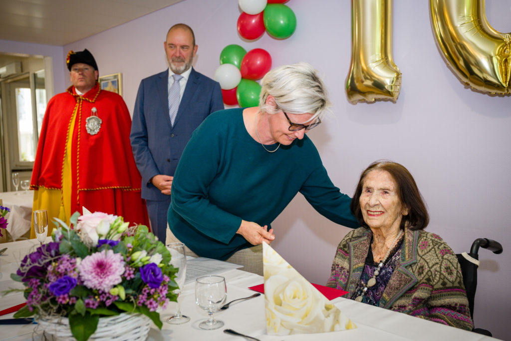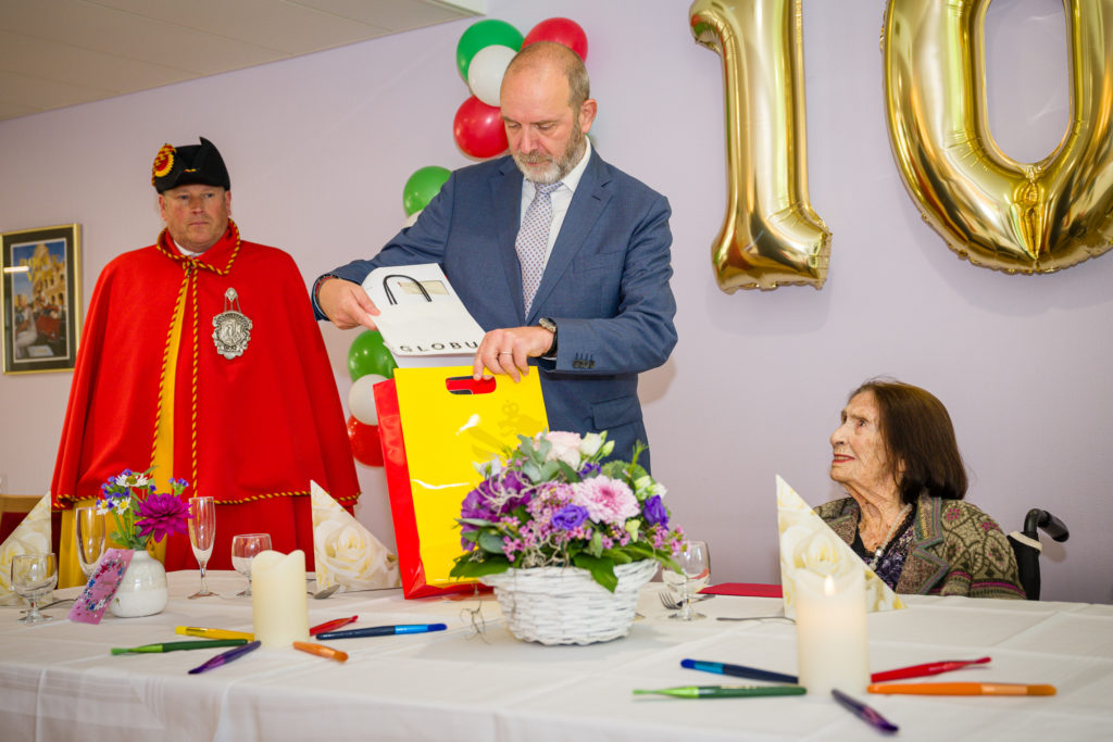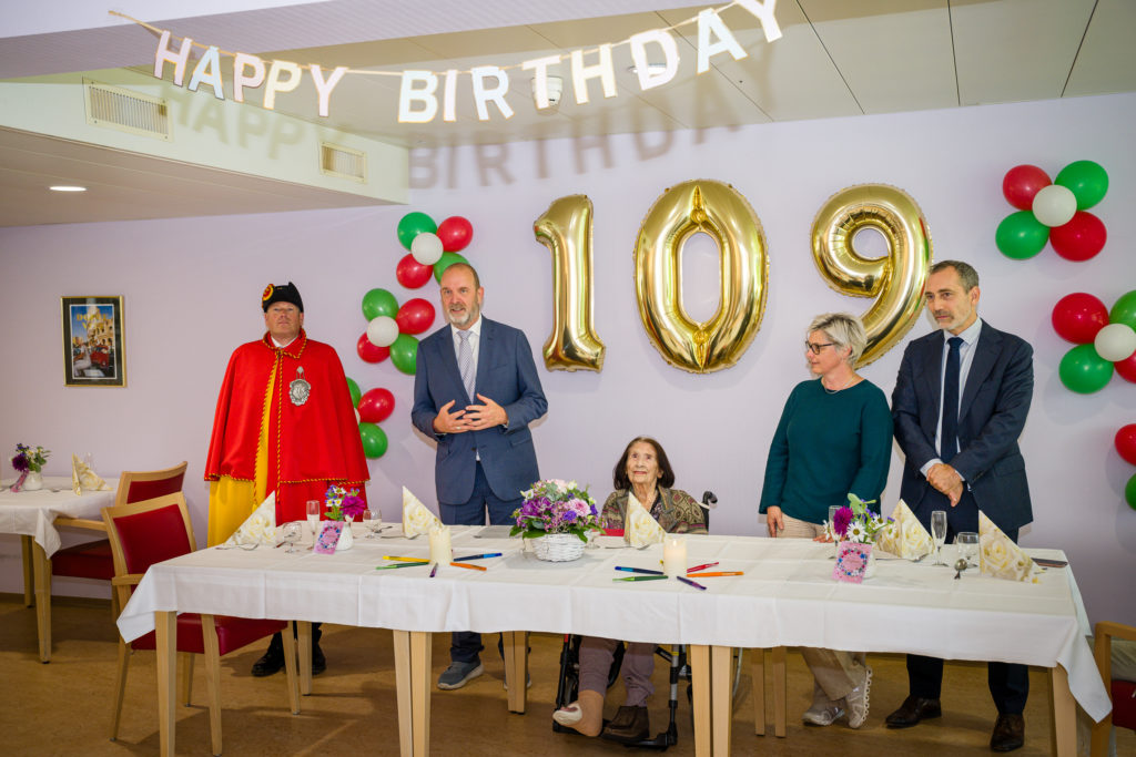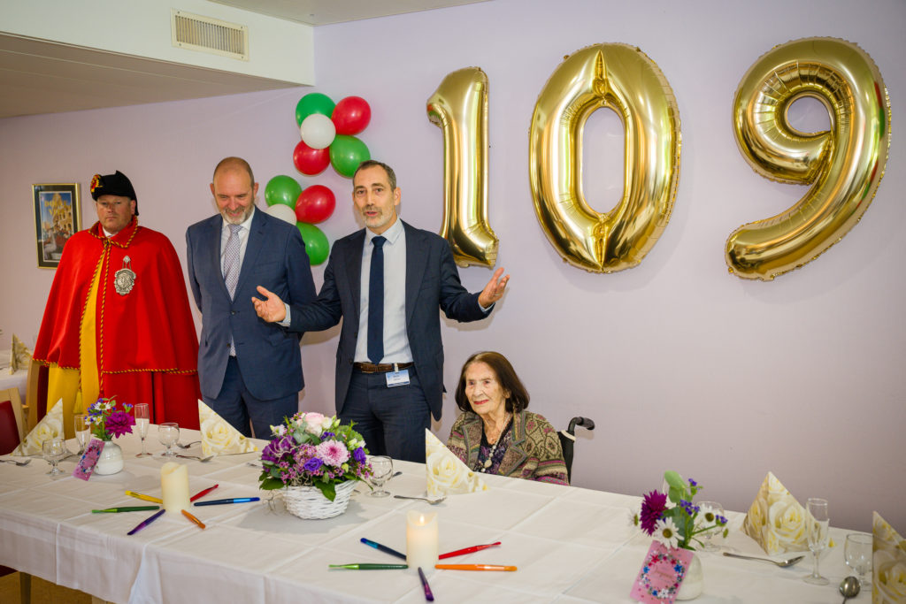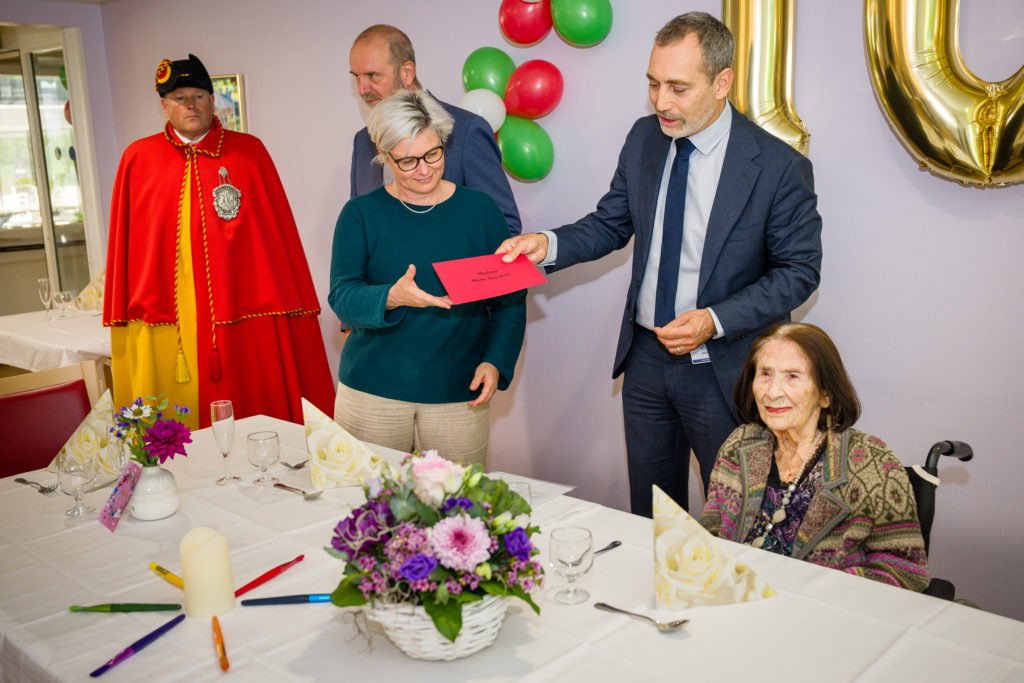 La cérémonie s’est tenue au bâtiment Cèdres de l’EMS, en présence de sa famille, des résidents de l’unité de vie et des collaborateurs de la MRPS. Thierry Apothéloz, conseiller d’État chargé de la Cohésion sociale, a honoré l’événement de sa présence. Comme le veut la tradition protocolaire, il était accompagné d’un huissier de l’État, vêtu de la cape aux couleurs de Genève. Étaient également présents Véronique Piatti Bretton, présidente de la Commission administrative de la MRPS, et Adrien Bron, directeur général de l’institution. Dans son allocution, M. Apothéloz a salué le parcours de Madame Benedetti et rendu hommage aux équipes de la MRPS, rappelant « le travail des collaborateurs au quotidien ». Il a également insisté sur la valeur des repères et des racines dans une société en constante évolution, soulignant l’importance de prendre le temps de célébrer ces moments qui fondent la mémoire collective.