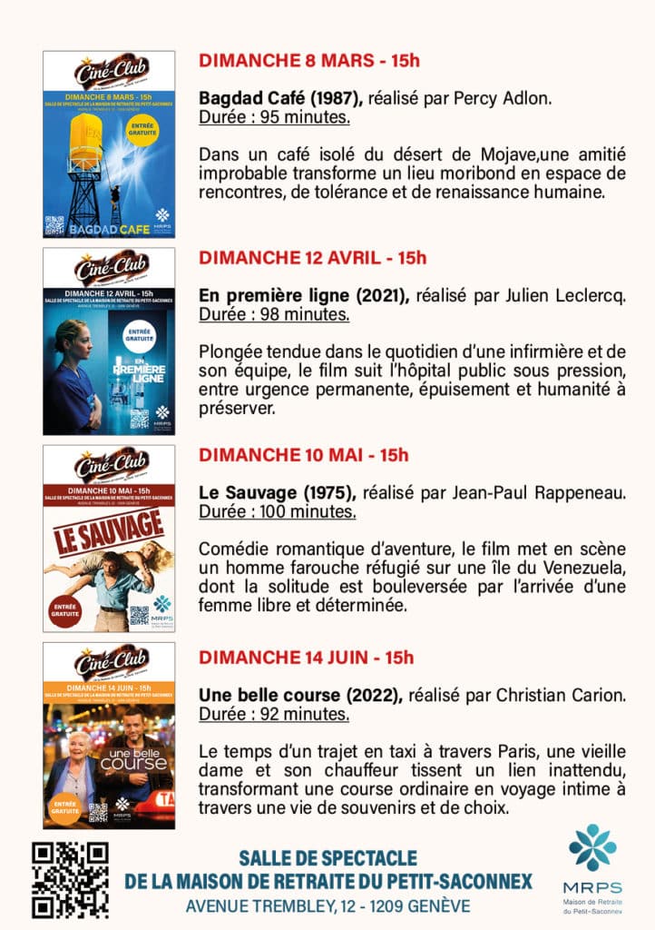 Plus d’informations sur le programme complet : Le ciné-club 2026 de la MRPS débutera ce dimanche 8 mars à 15h à la salle de spectacle située Avenue Trembley, 12.